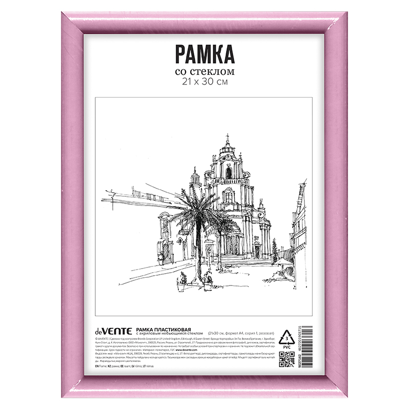 Рамка пластиковая "deVENTE" 21x30 см, формат A4, серия 1, акриловое стекло, задняя панель - переплетный картон, с креплением для подвеса, розовый, в термоусадочной пленке