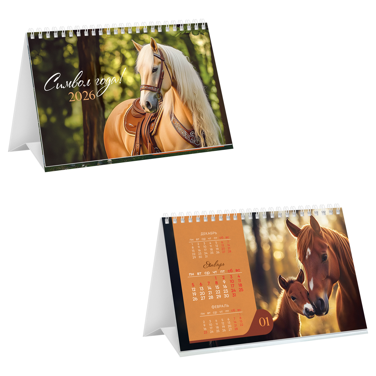 Календарь настольный перекидной BG «Год лошади» на 2026 год – незаменимая вещь на рабочем столе и отличный помощник для офиса. Размер горизонтального календаря – 160*105 мм, тип скрепления – гребень/спираль. Календарь имеет подложку с рисунком и 7 листов с календарной сеткой на 3 месяца. Календарный блок изготовлен из мелованной бумаги плотностью 105 г/м2 с полноцветной печатью. Нижняя подложка изготовлена из картона плотностью 320 г/м2. Индивидуальная упаковка в пакет с европодвесом.