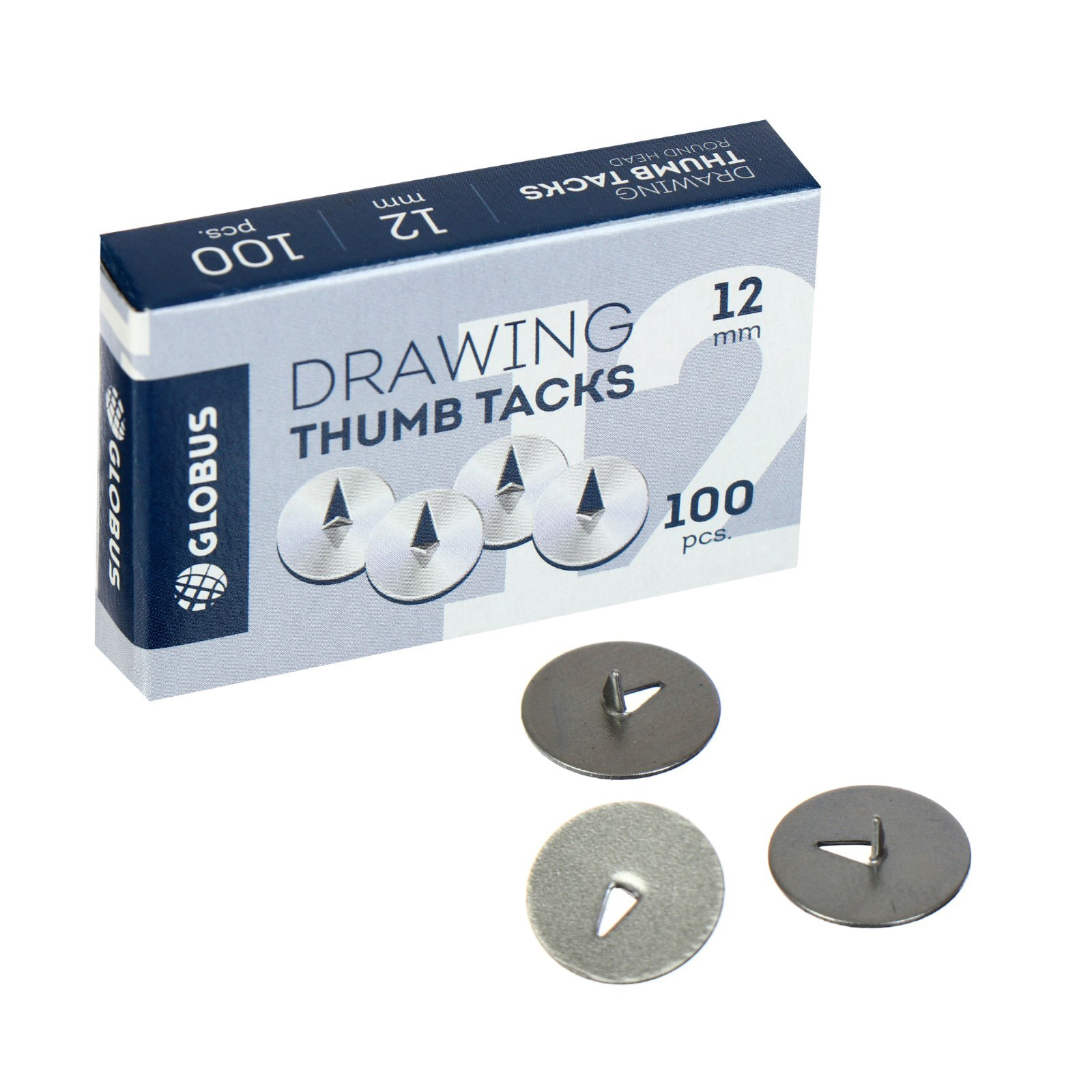 Кнопки канцелярские из металла с диаметром шляпки 12 мм. Тип ножки треугольный. Количество в упаковке 100 штук.
