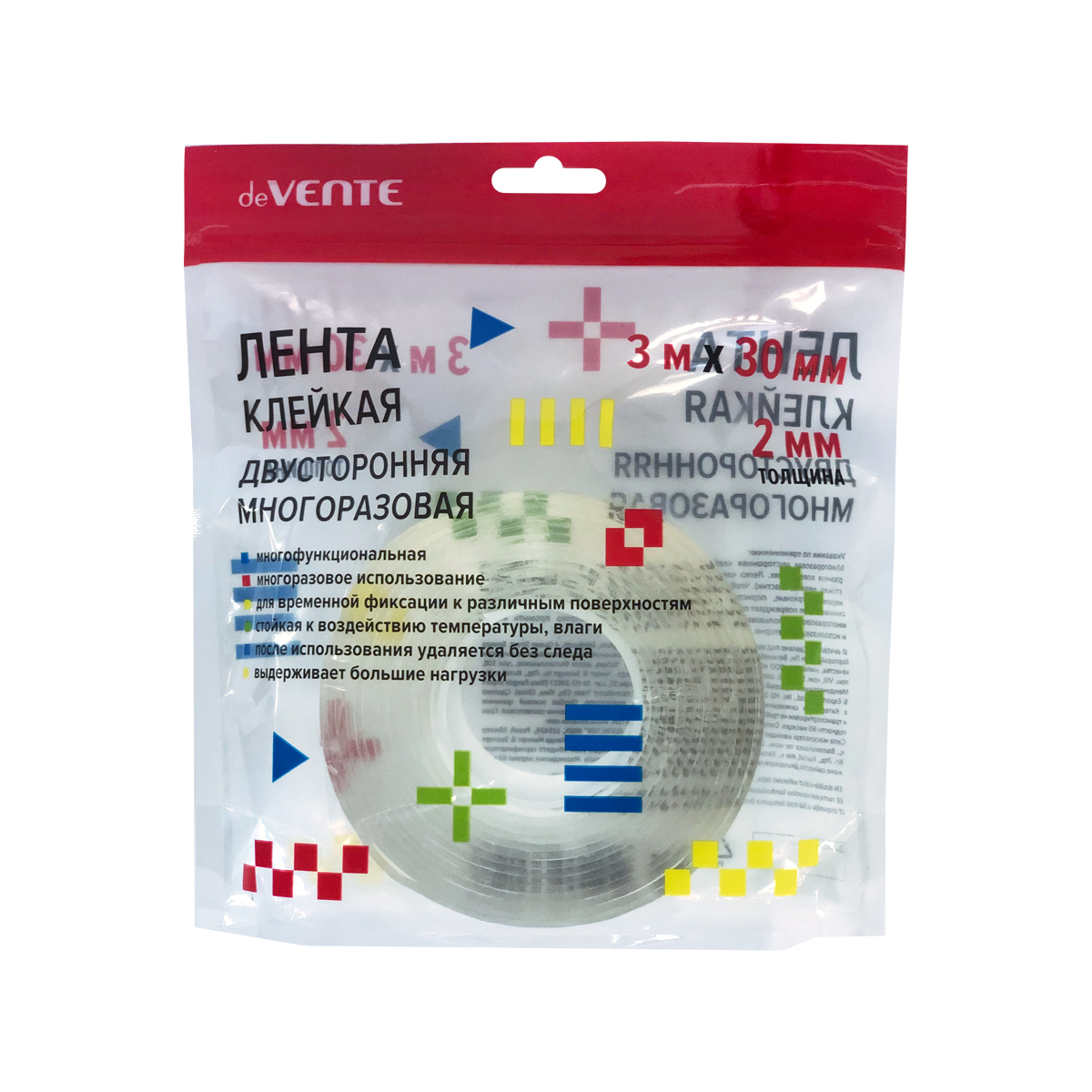 Код товара: 00-00079959Клейкая лента 30мм/3м deVENTE 4163306 Nano Tape толщина 1мм многоразовая