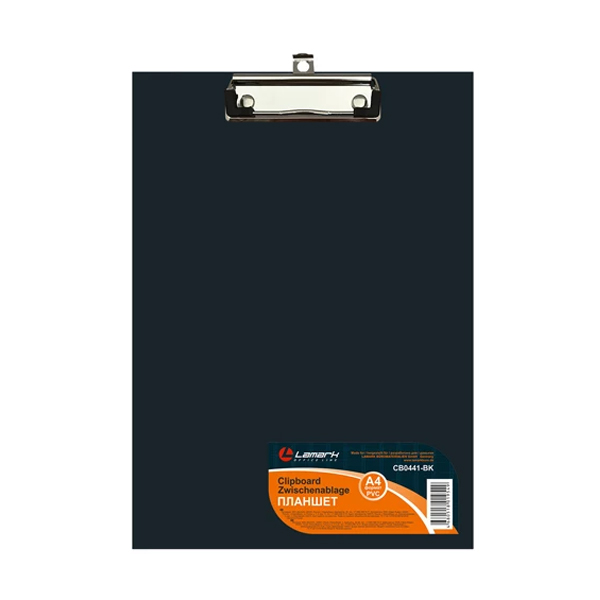 Планшет Lamark c верхним металлическим зажимом выполнен из плотного картона, заламинированного PVC пленкой. Толщина 2 мм. Цвет черный. Для документов формата А4. Еврофурнитура: зажим с подвесом, с пластмассовыми уголками. . Широкое применение - склад и логистика, торговые представители, курьерские службы, внешкольные занятия.