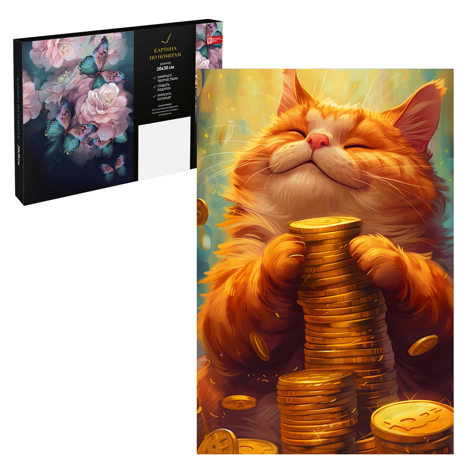 Набор для творчества Картина по номерам арт. 67922 / 40 КОТ С ДЕНЬГАМИ, размер: 20х30 см, (16 цвета (-ов), холст на деревянном подрамнике с напечатанной схемой рисунка, контрольный лист с нанесенной схемой, краски акриловые на водной основе, кисти художественные с ворсом из нейлона – 4 шт., подвесы для подрамника, пакет на zip-молнии, лак в комплекте, картонная коробка)