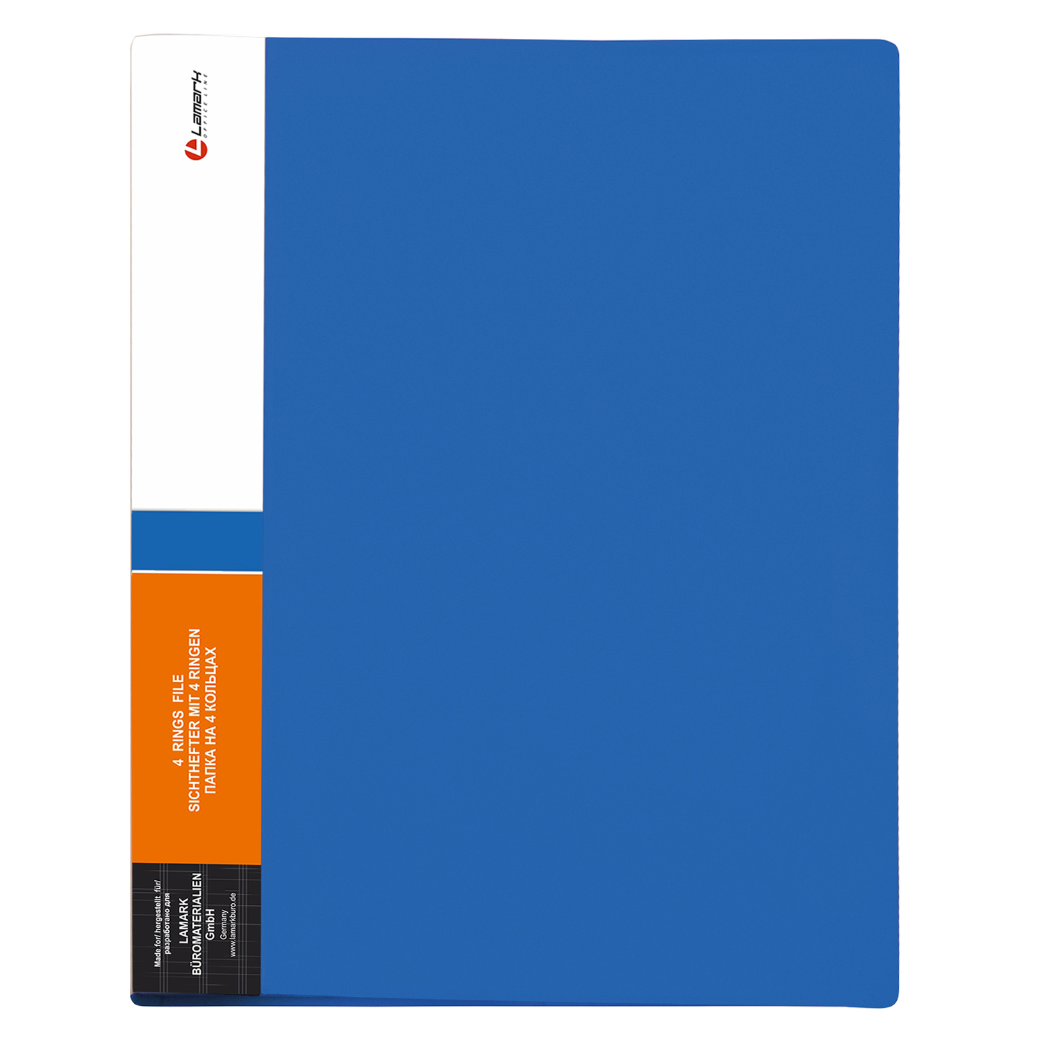 Папка Lamark на 4 кольцах диаметром 25 мм, корешок 32 мм, толщина пластика 0,60 мм. Цвет синий. На корешке карман с индексной вставкой. Идеальна для подборки и хранения документов.