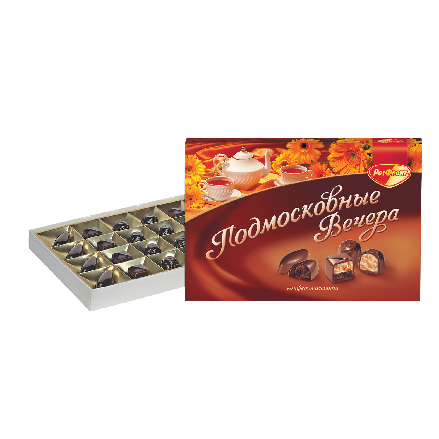 Конфеты шоколадные РОТ ФРОНТ "Подмосковные вечера" - набор конфет ассорти с тремя начинками: с шоколадным вкусом,кремовой со вкусом пломбира и лесного ореха и двойной начинкой - помадно-сливочной с карамельным вкусом и нежным кремовой с шоколадным вкусом.