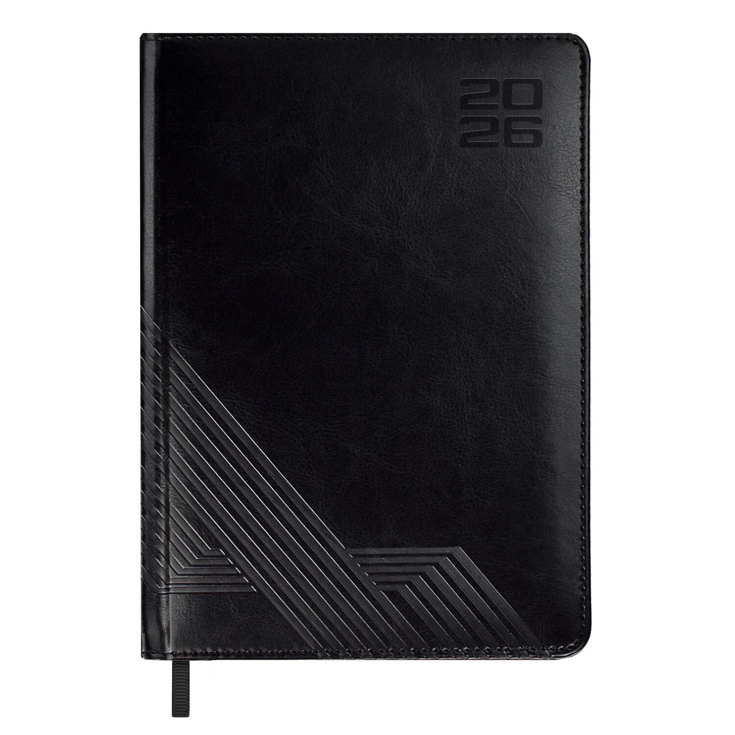 Ежедневник датированный 2026 ESCALADA, А5, 176 л., арт. 70218/ 15 САРИФ ЧЁРНЫЙ (кожзам: 146x211 мм, твёрдый переплёт с поролоном, материал обложки: искусственная кожа "Сариф"; декор: блинтовое тиснение; способ крепления блока: ниткошвейный; вн. блок: 176 л., белый офсет 70 г/м², печать в две краски (линия), справочный материал: есть; перфорация углов блока: есть; закладка/-и: одно ляссе; каптал: есть; форзац: печать в одну краску; персонализация возможна: да; индивидуальная упаковка: ПЭТ-пакет)