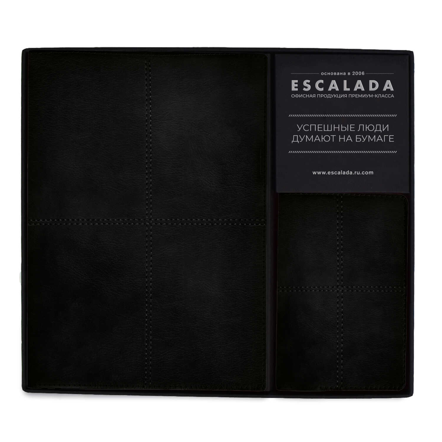 Ежедневник недатированный + обложка для паспорта (набор подарочный) ESCALADA, А5+, 120 л., арт. 70557/ 10 ШЕВРЕТ ЧЁРНЫЙ (кожзам: ежедневника: 175x245 мм, обложки для паспорта: 95х145 мм, мягкий переплёт, запаянный край, материал обложки: искусственная кожа "Шеврет"; способ крепления блока: ниткошвейный; декор: блинтовое тиснение, отделочная строчка; вн. блок: 120 л., кремовый офсет 70 г/м², печать в одну краску (клетка), справочный материал: есть; перфорация углов блока: нет; отделка среза: окрашивание пантоном; закладка/-и: два ляссе, каптал: есть; форзац: печать пантоном, персонализация возможна: да; индивидуальная упаковка: подарочная картонная коробка с ПВХ-крышкой + ПЭТ-пакет)