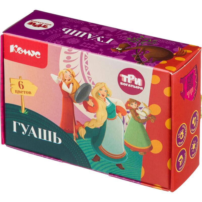 Гуашь «Три Богатыря» отличает высокая кроющая способность краски. Цвета насыщенные, глубокие, отлично перекрываются и образуют матовую бархатистую поверхность по мере высыхания краски. При этом сохраняется яркость и насыщенность тона, краски ложатся ровно, не осыпаются. Хорошо разводится и размывается водой, легко набирается на кисть. Краски упакованы в цветную картонную коробку, размер упаковки: 115×40×155 мм. Объем одной баночки — 20 мл. Поставляется без кисти.
