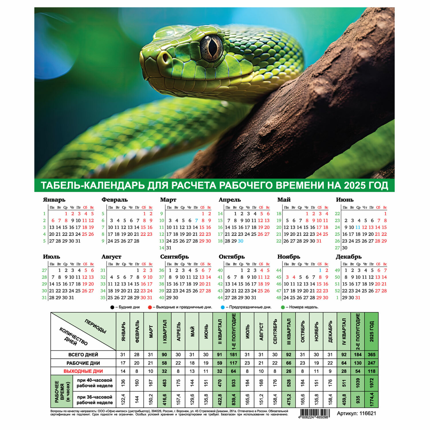 Календарь-табель для расчета рабочего времени на 2025 год напечатан на мелованной бумаге, оформлен ярким и стильным постером с изображением символа года.