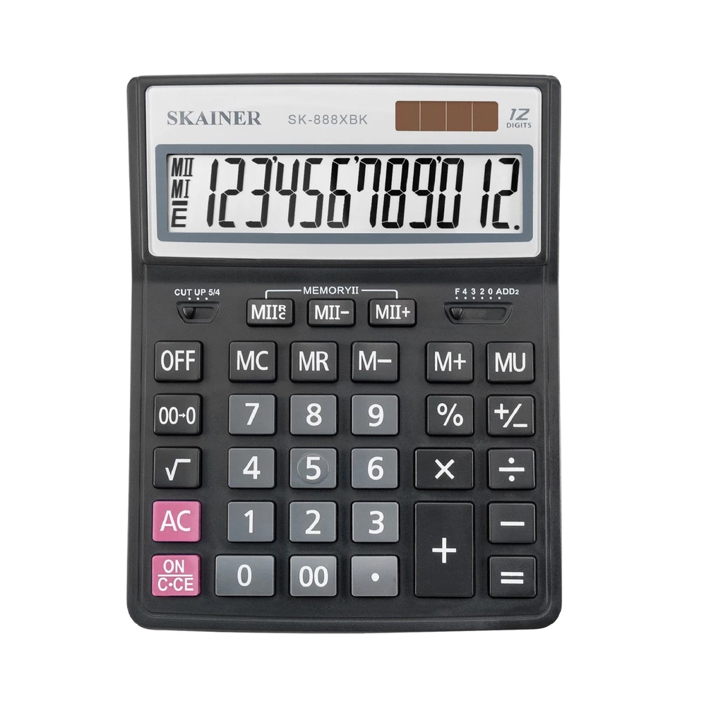 Настольный калькулятор Skainer SK-888XBK популярен как среди бухгалтеров, так и среди продавцов, банковских и офисных сотрудников. Пластиковый корпус, 12 разрядов, двойное питание, две независимые памяти, цвет черный