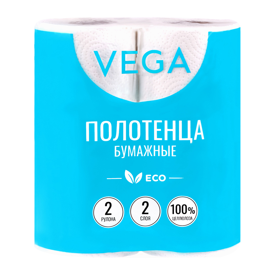 Полотенца бумажные двухслойные ТМ Vega. Цвет - белый. Состав сырья: 100% целлюлоза, с перфорацией и тиснением. 2 рулона в упаковке.