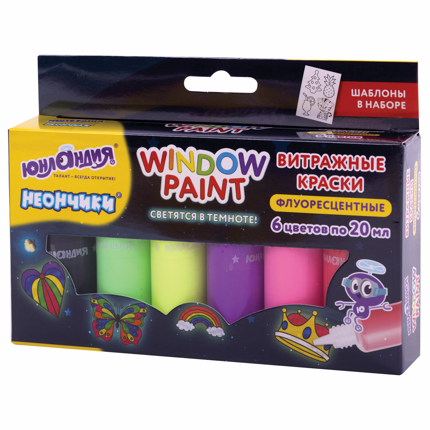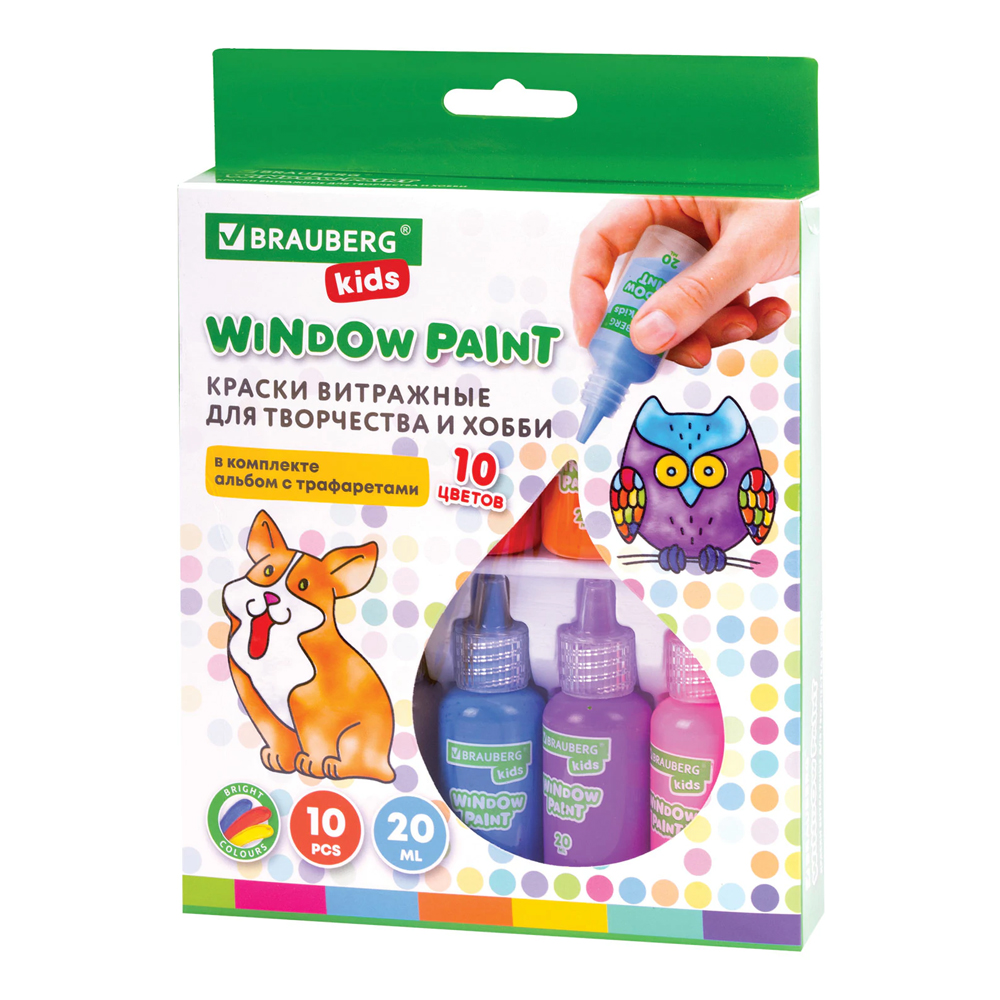 Код товара: 00-00100662Краски витражные 10цв Brauberg Kids 191761, 10 туб по 20 мл, шаблоны