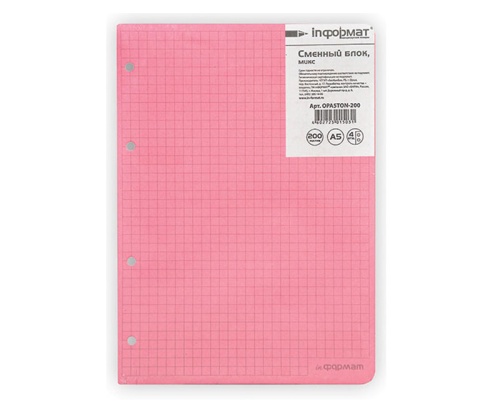 Код товара: 00-00088659Блок сменный для тетради на кольцах А5/50л inФормат ОРА5Р-50 тон.блок розовый