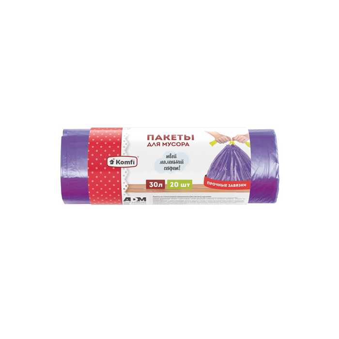 Код товара: 00-00107471Мешки для мусора 30л 20шт Komfi, MUSFI2, с завязками, фиолетовые
